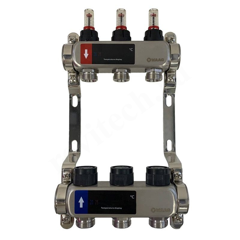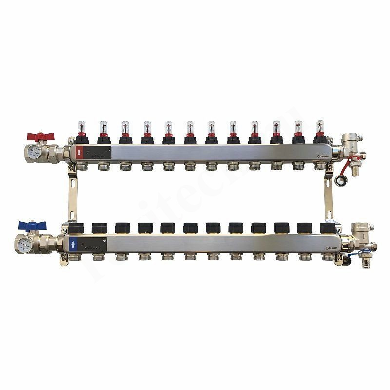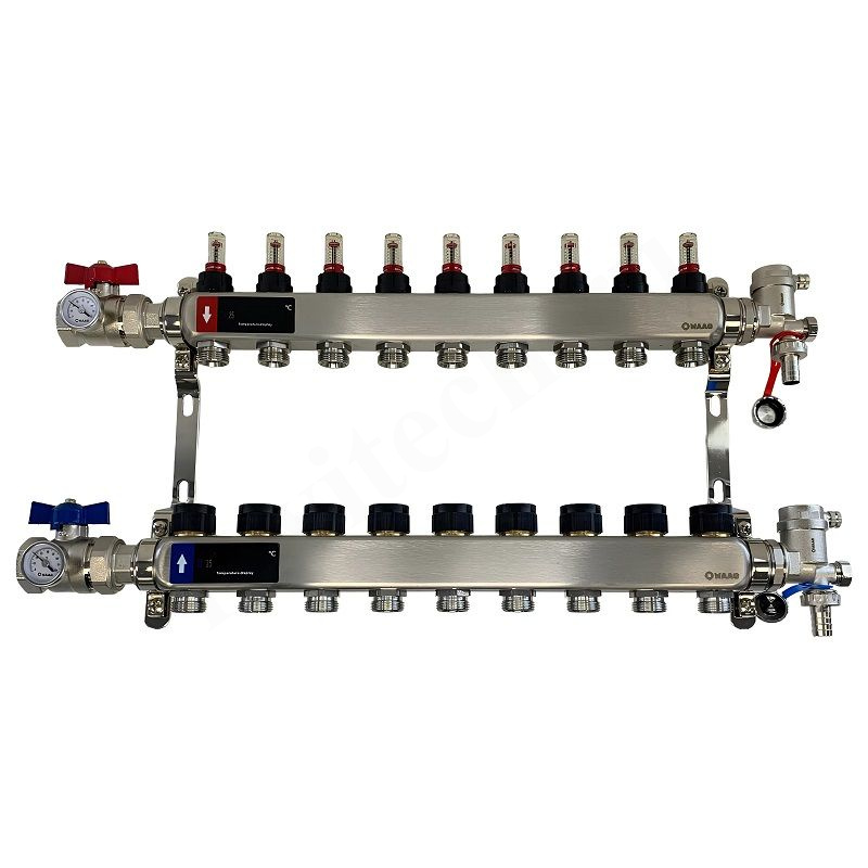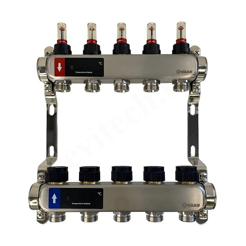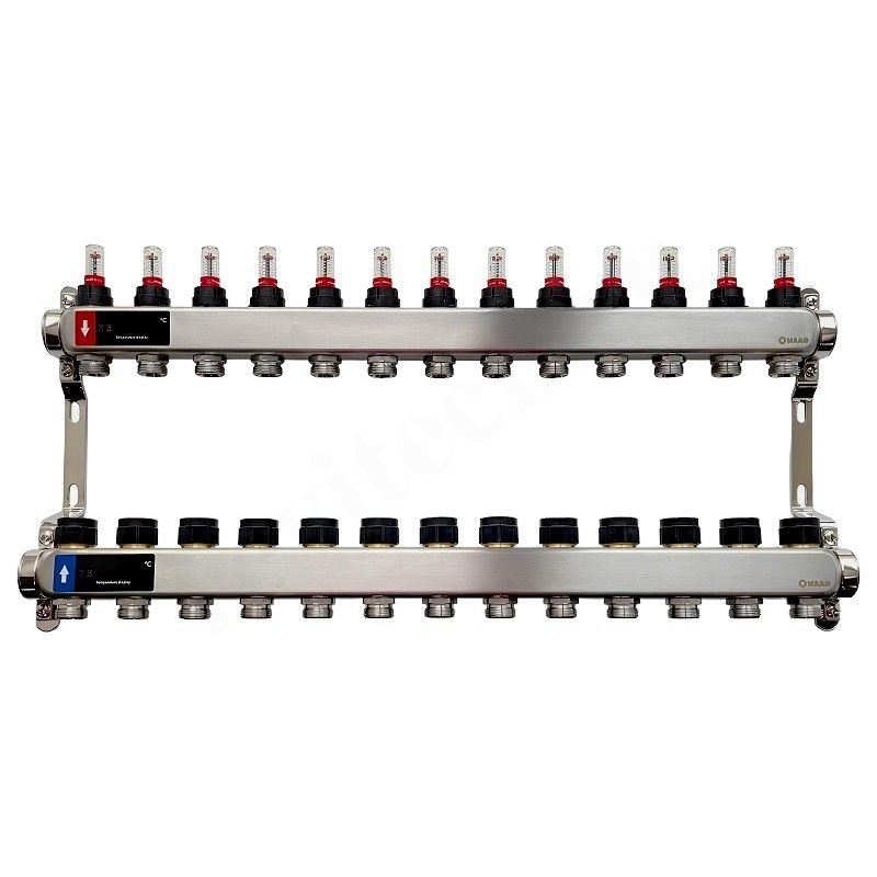 • Межосевые расстояния между выходами 50 мм, что позволяет легко подключать трубопроводы к самому коллектору.