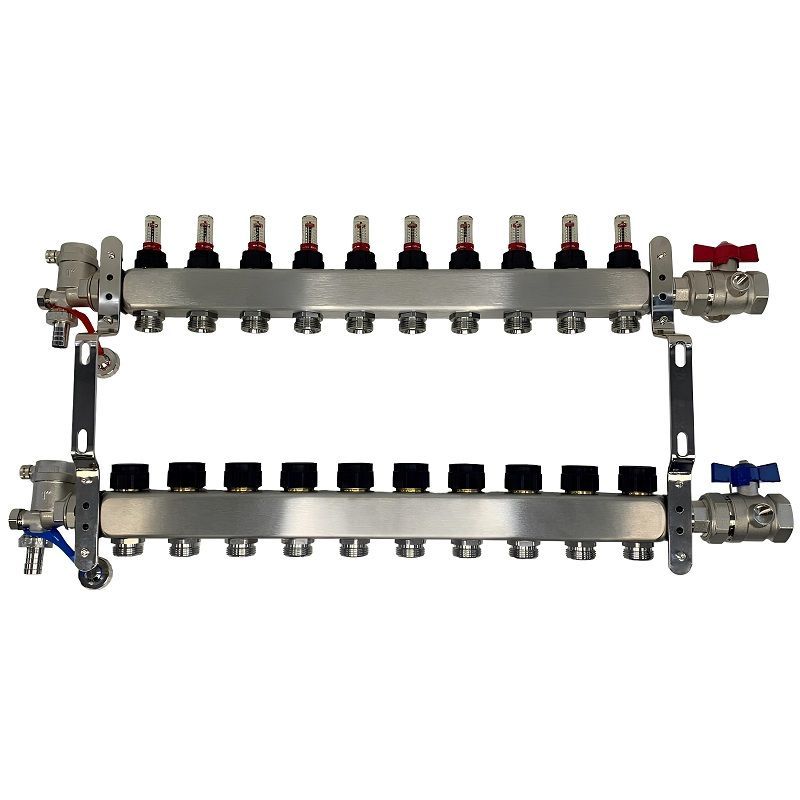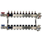 Коллекторный блок из нержавеющей стали служит для распределения потоков по контурам теплого пола, радиаторного отопления, прочих климатических систем, где в качестве теплоносителя используется вода либо незамерзающие растворы гликоля с максимальной рабочей температурой 90 °С, рабочим давлением до 9 бар.