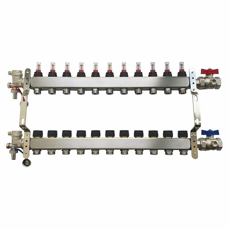 Коллекторный блок из нержавеющей стали служит для распределения потоков по контурам теплого пола, радиаторного отопления, прочих климатических систем, где в качестве теплоносителя используется вода либо незамерзающие растворы гликоля с максимальной рабочей температурой 90 °С, рабочим давлением до 9 бар.