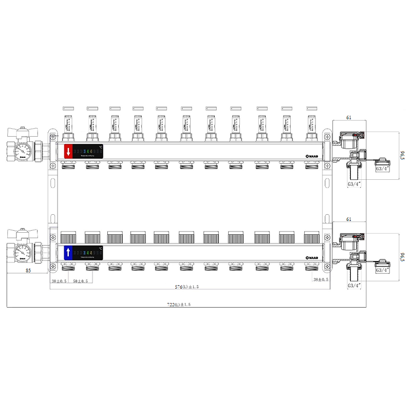 Условный диаметр коллекторов – 1″. Резьба выходов – наружная, 3/4″.