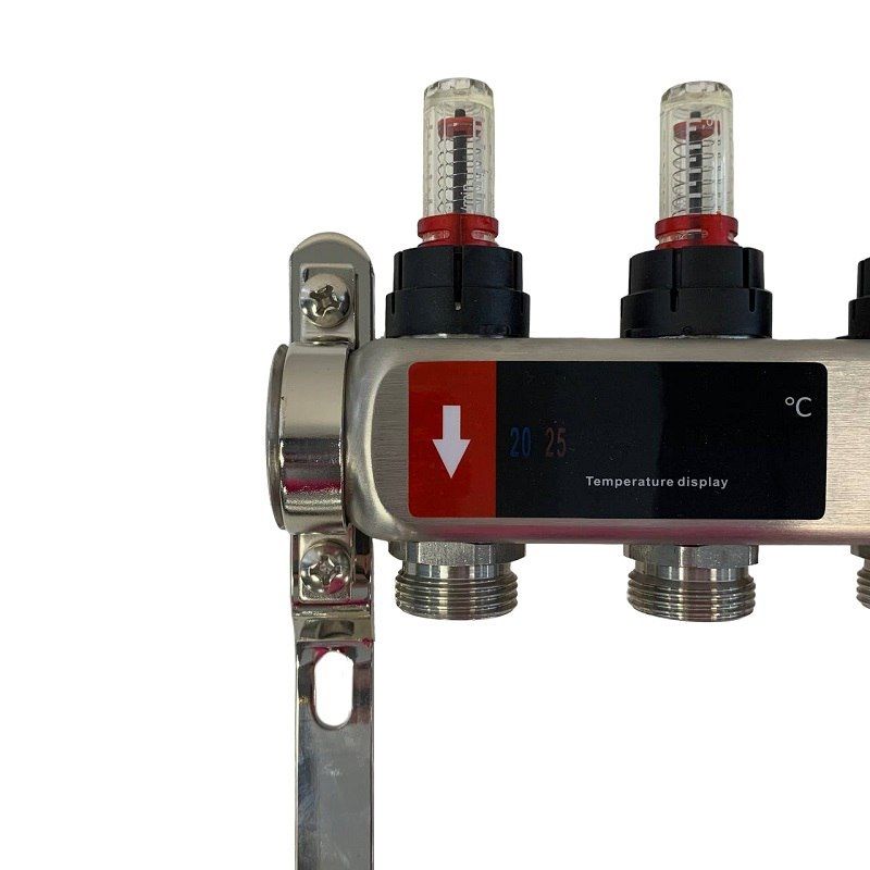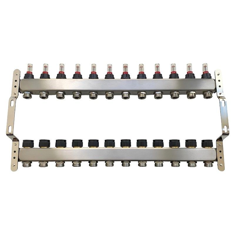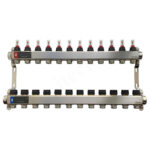 Коллекторный блок из нержавеющей стали служит для распределения потоков по контурам теплого пола, радиаторного отопления, прочих климатических систем, где в качестве теплоносителя используется вода либо незамерзающие растворы гликоля с максимальной рабочей температурой 90 °С, рабочим давлением до 9 бар.
