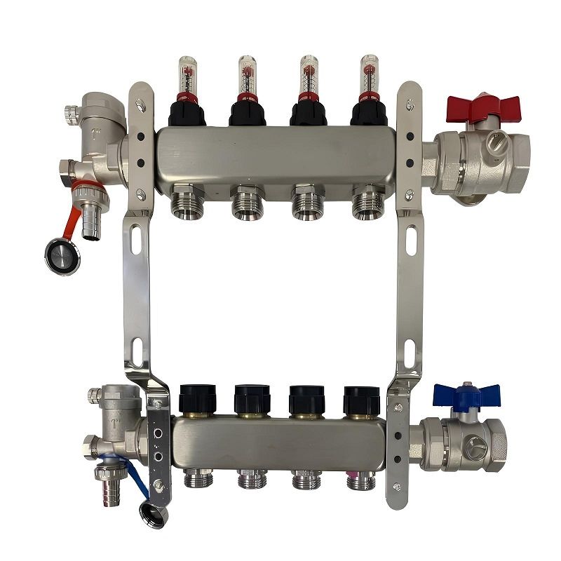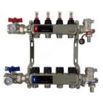 Коллекторный блок из нержавеющей стали служит для распределения потоков по контурам теплого пола, радиаторного отопления, прочих климатических систем, где в качестве теплоносителя используется вода либо незамерзающие растворы гликоля с максимальной рабочей температурой 90 °С, рабочим давлением до 9 бар.