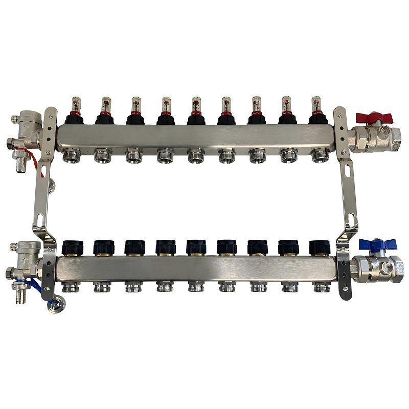 Коллекторный блок из нержавеющей стали служит для распределения потоков по контурам теплого пола, радиаторного отопления, прочих климатических систем, где в качестве теплоносителя используется вода либо незамерзающие растворы гликоля с максимальной рабочей температурой 90 °С, рабочим давлением до 9 бар.