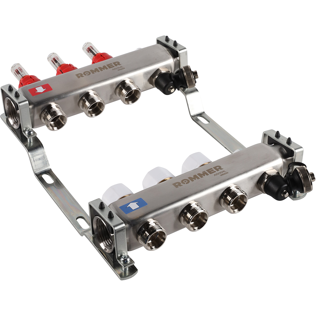 ROMMER Коллектор из нержавеющей стали с расходомерами, с клапаном вып. воздуха и сливом 3 вых. RMS-1201-000003