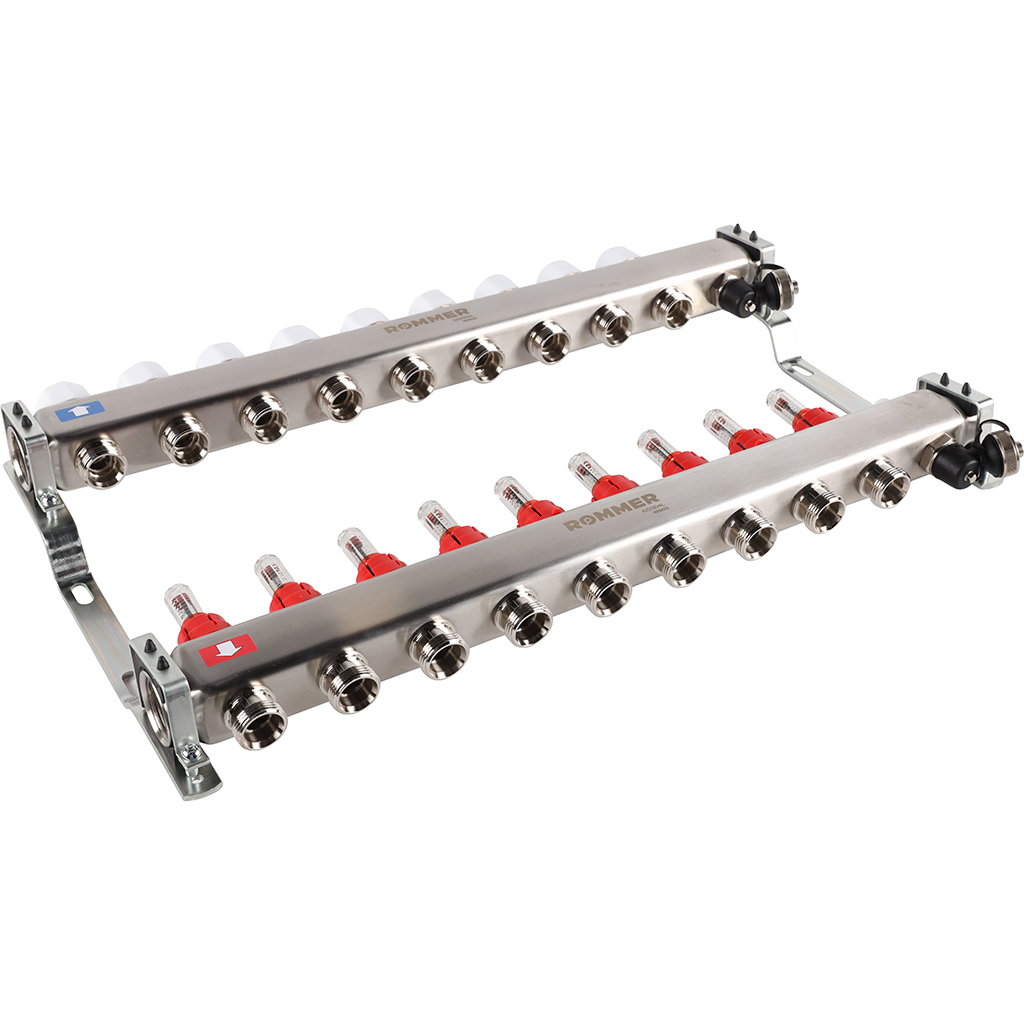 ROMMER Коллектор из нержавеющей стали с расходомерами, с клапаном вып. воздуха и сливом 9 вых. RMS-1201-000009