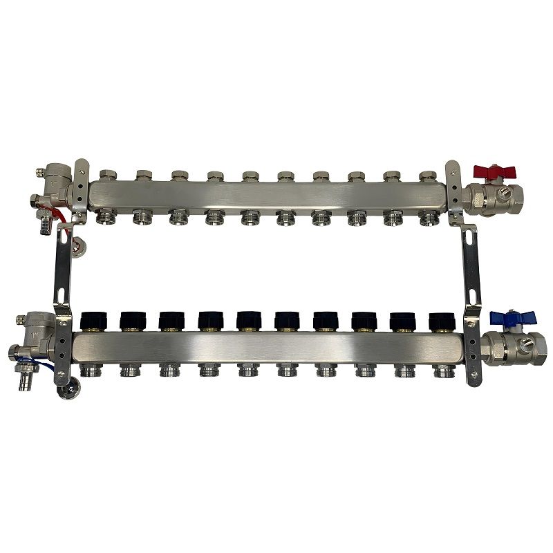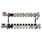Коллекторный блок из нержавеющей стали служит для распределения потоков по контурам теплого пола, радиаторного отопления, прочих климатических систем, где в качестве теплоносителя используется вода либо незамерзающие растворы гликоля с максимальной рабочей температурой 90 °С, рабочим давлением до 9 бар.