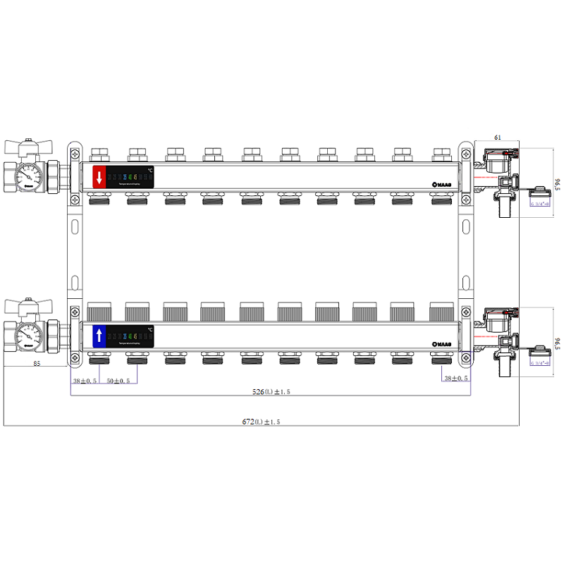 Выходы обратного коллектора блока оборудованы регулировочными клапанами с возможностью установки электротермических сервоприводов, подающего – настроечными микрометрическими клапанами.