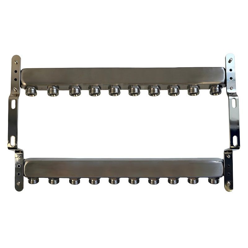 Коллекторный блок из нержавеющей стали служит для распределения потоков по контурам теплого пола, радиаторного отопления, прочих климатических систем, где в качестве теплоносителя используется вода либо незамерзающие растворы гликоля с максимальной рабочей температурой 90 °С, рабочим давлением до 9 бар.