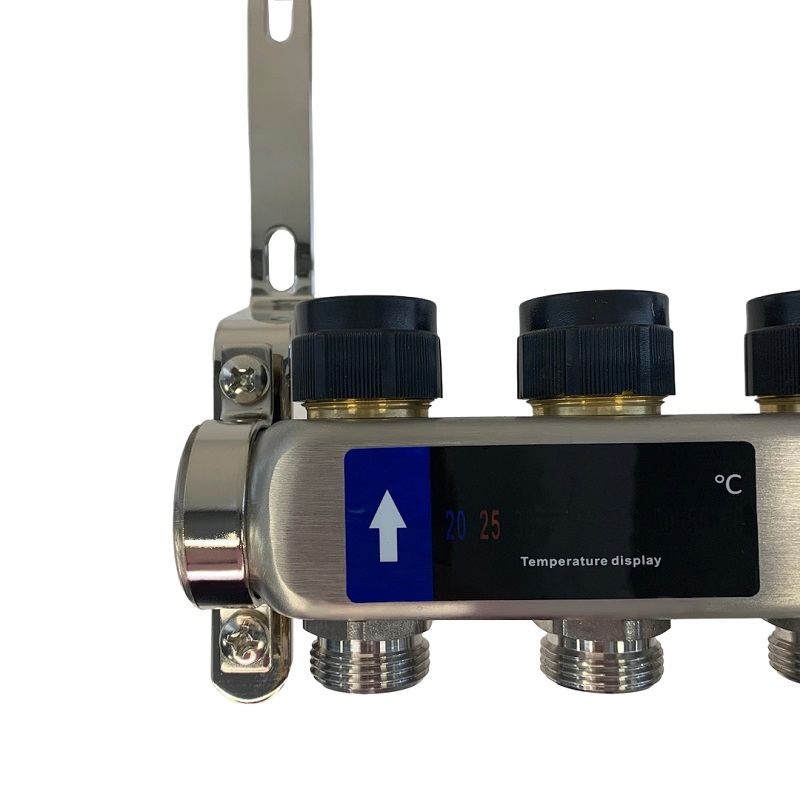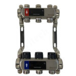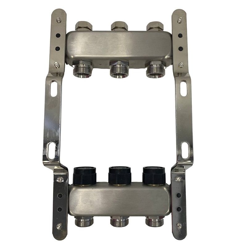 Коллекторный блок из нержавеющей стали служит для распределения потоков по контурам теплого пола, радиаторного отопления, прочих климатических систем, где в качестве теплоносителя используется вода либо незамерзающие растворы гликоля с максимальной рабочей температурой 90 °С, рабочим давлением до 9 бар.