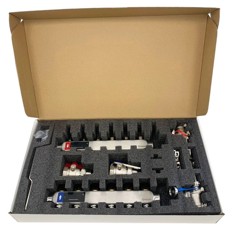 В комплекте: коллектор, воздухоотводчик, кран шаровой с манометром, крепление, упаковка