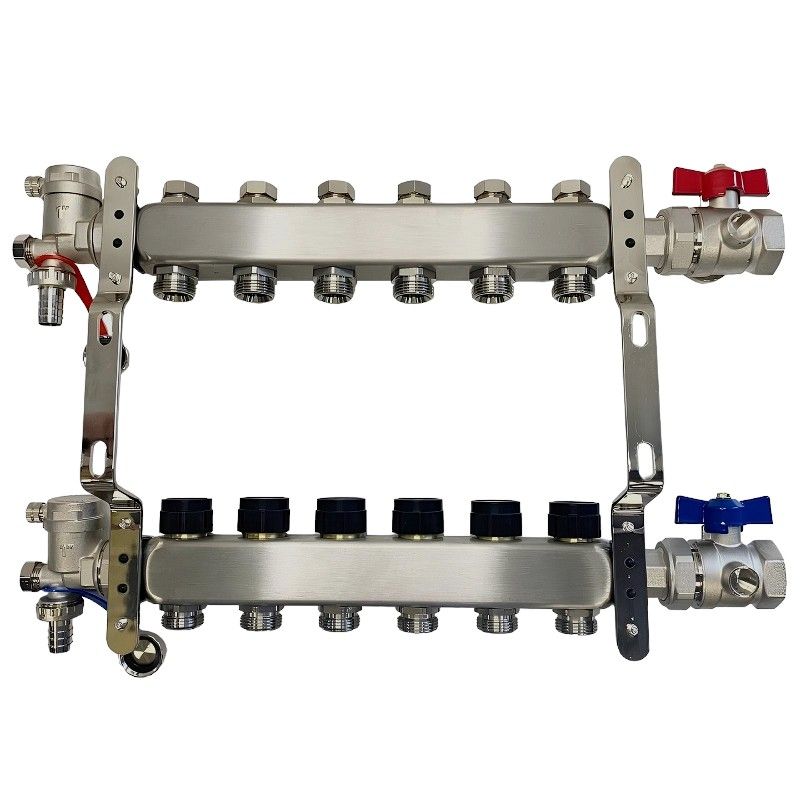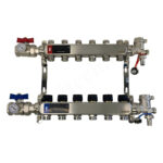 Коллекторный блок из нержавеющей стали служит для распределения потоков по контурам теплого пола, радиаторного отопления, прочих климатических систем, где в качестве теплоносителя используется вода либо незамерзающие растворы гликоля с максимальной рабочей температурой 90 °С, рабочим давлением до 9 бар.