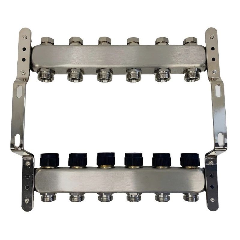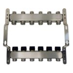 Коллекторный блок из нержавеющей стали служит для распределения потоков по контурам теплого пола, радиаторного отопления, прочих климатических систем, где в качестве теплоносителя используется вода либо незамерзающие растворы гликоля с максимальной рабочей температурой 90 °С, рабочим давлением до 9 бар.