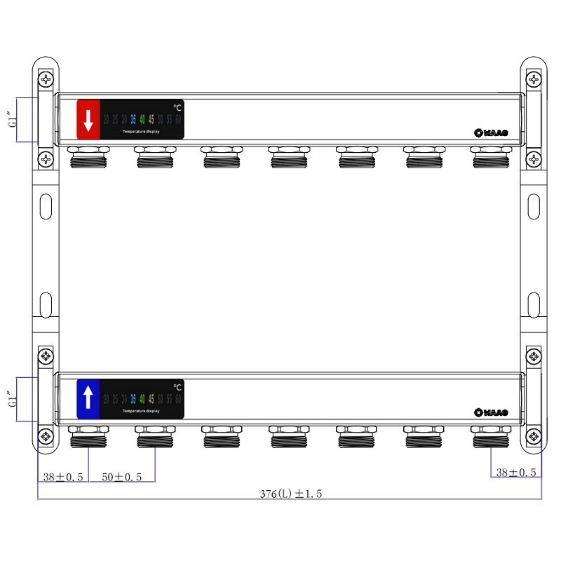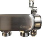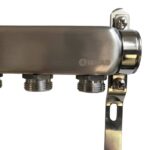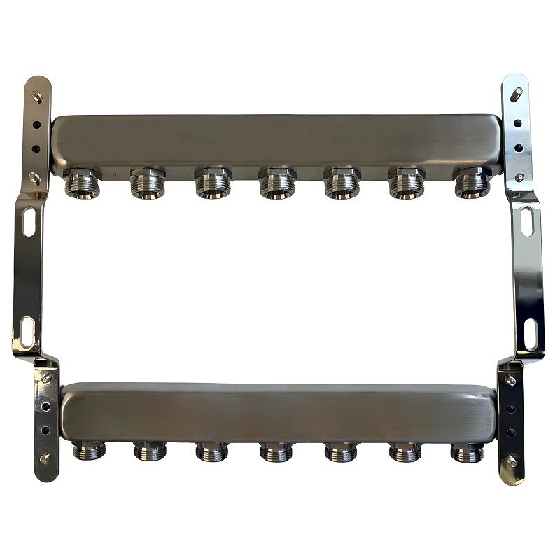 Коллекторный блок из нержавеющей стали служит для распределения потоков по контурам теплого пола, радиаторного отопления, прочих климатических систем, где в качестве теплоносителя используется вода либо незамерзающие растворы гликоля с максимальной рабочей температурой 90 °С, рабочим давлением до 9 бар.