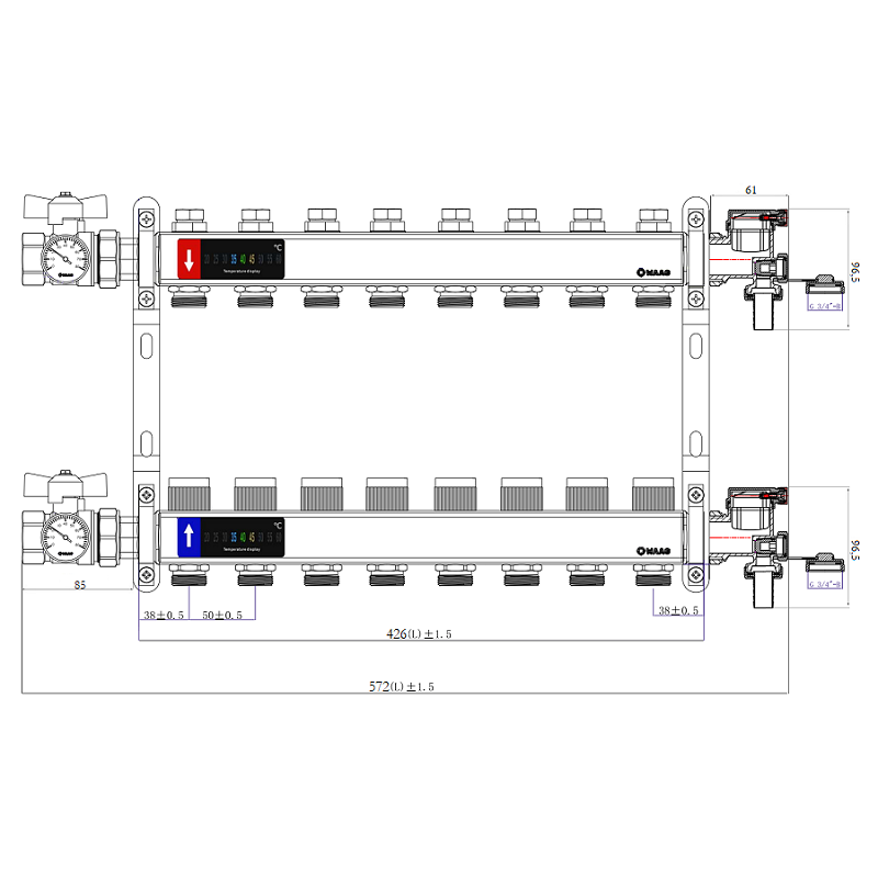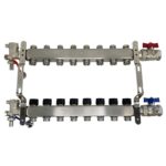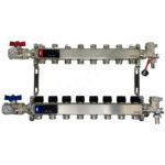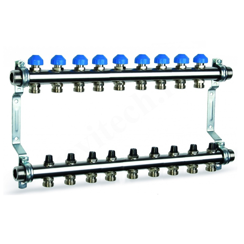 Коллекторный блок из нержавеющей стали служит для распределения потоков по контурам теплого пола, радиаторного отопления, прочих климатических систем, где в качестве теплоносителя используется вода либо незамерзающие растворы гликоля с максимальной рабочей температурой 90 °С, рабочим давлением до 9 бар.