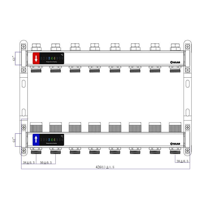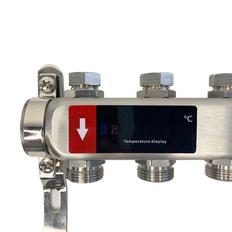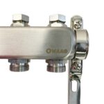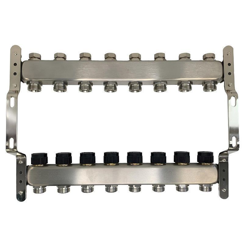 Коллекторный блок из нержавеющей стали служит для распределения потоков по контурам теплого пола, радиаторного отопления, прочих климатических систем, где в качестве теплоносителя используется вода либо незамерзающие растворы гликоля с максимальной рабочей температурой 90 °С, рабочим давлением до 9 бар.
