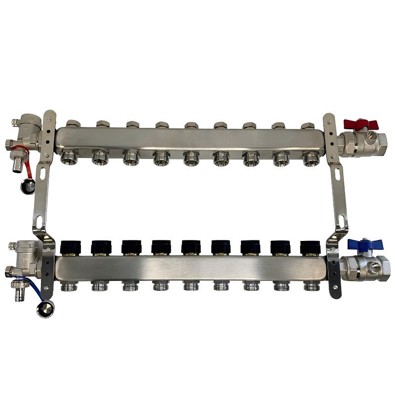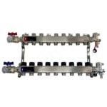 Коллекторный блок из нержавеющей стали служит для распределения потоков по контурам теплого пола, радиаторного отопления, прочих климатических систем, где в качестве теплоносителя используется вода либо незамерзающие растворы гликоля с максимальной рабочей температурой 90 °С, рабочим давлением до 9 бар.