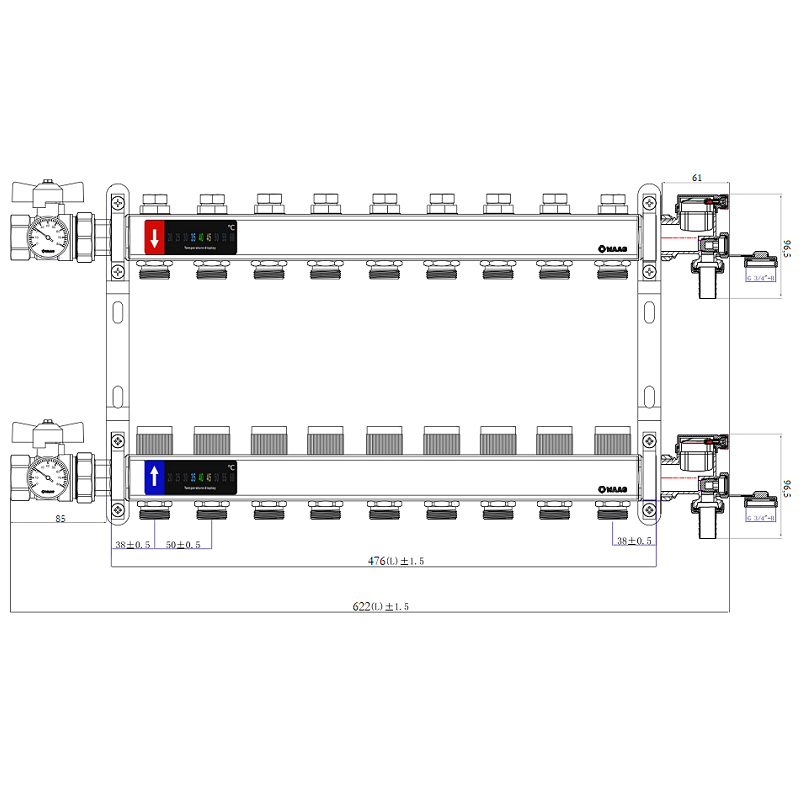 Выходы обратного коллектора блока оборудованы регулировочными клапанами с возможностью установки электротермических сервоприводов, подающего – настроечными микрометрическими клапанами.