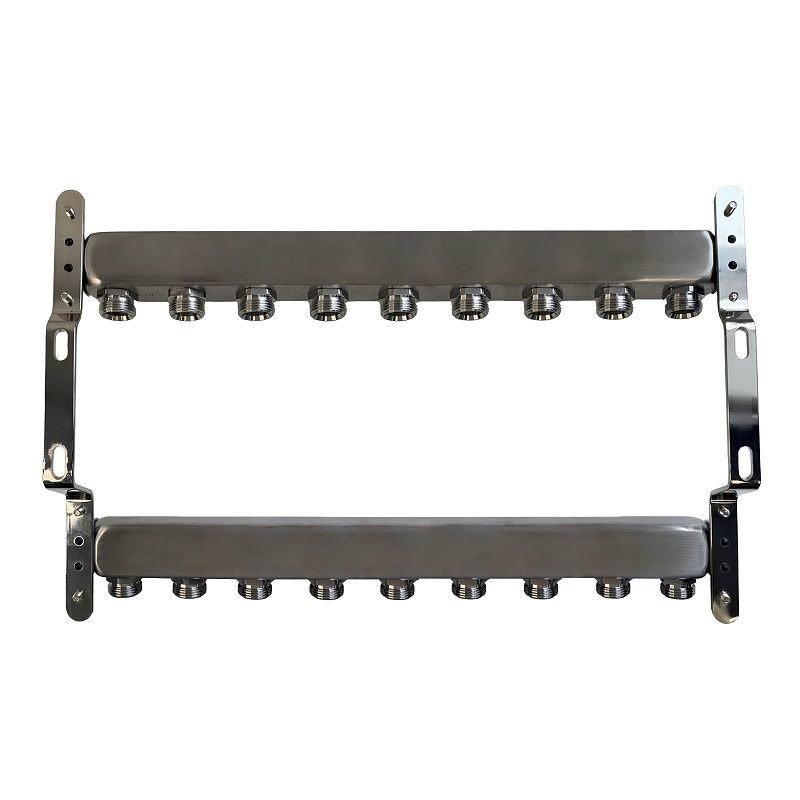 Коллекторный блок из нержавеющей стали служит для распределения потоков по контурам теплого пола, радиаторного отопления, прочих климатических систем, где в качестве теплоносителя используется вода либо незамерзающие растворы гликоля с максимальной рабочей температурой 90 °С, рабочим давлением до 9 бар.