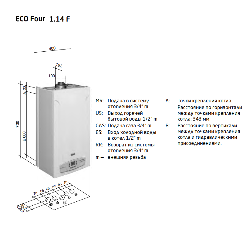 Газовый конвекционный настенный котел Baxi ECO FOUR 1.14 F артикул CSE46114354- мощностью 14 кВт с закрытой камерой сгорания.