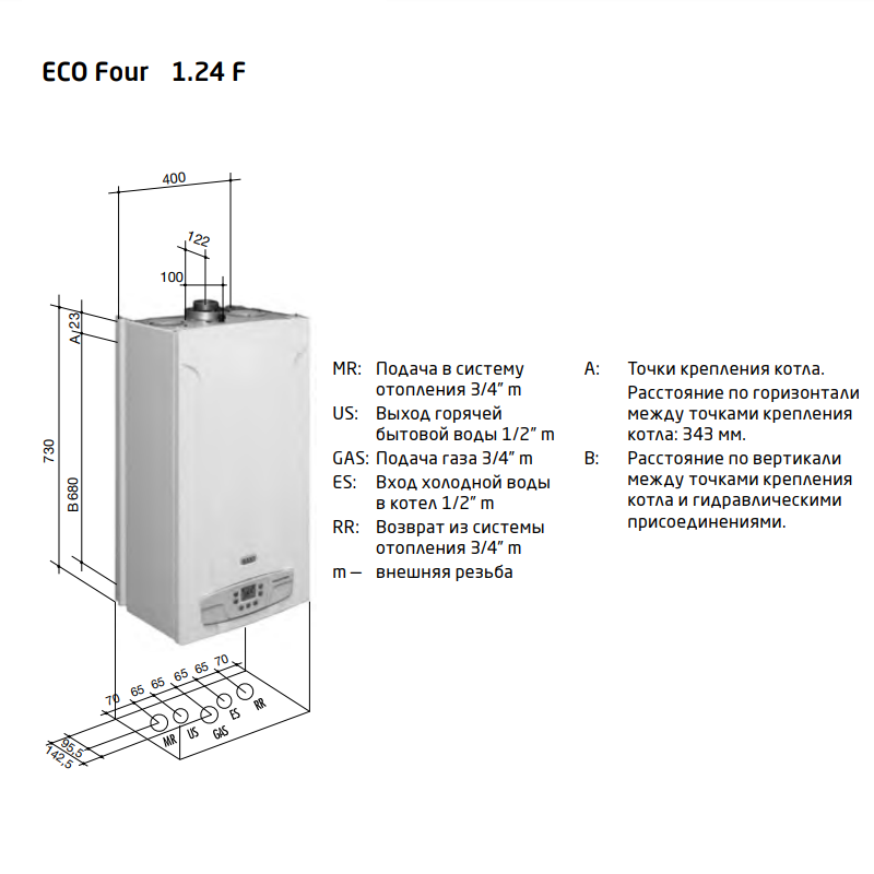 Газовый конвекционный настенный котел Baxi ECO FOUR 1.24 F артикул CSE46524354- мощностью 24 кВт с закрытой камерой сгорания.