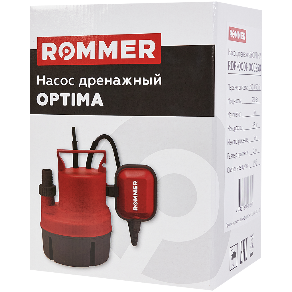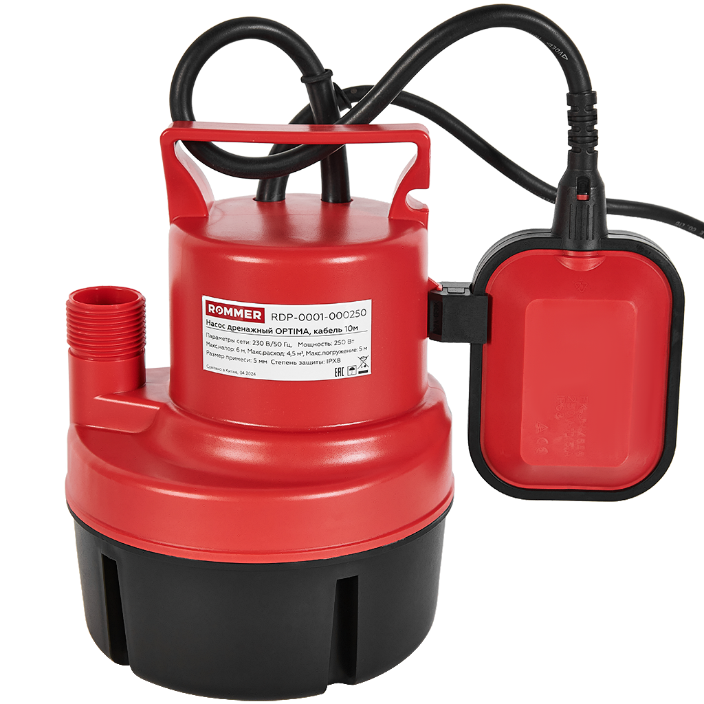 RDP-0001-000250 ROMMER OPTIMA Насос дренажный, H-6м,Q-4.5м3/ч, кабель 10м, 250 Вт