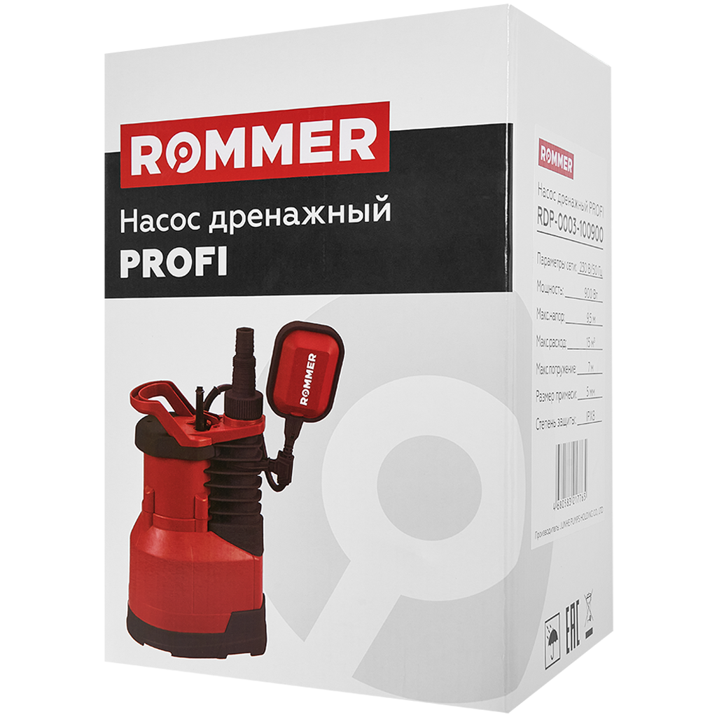 RDP-0003-100900 ROMMER PROFI Насос дренажный, H-9.5м,Q-15м3/ч, кабель 10м, 900 Вт, для чистой воды