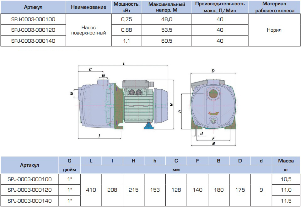 SPJ-0003-000100 STOUT Насос поверхностный, корпус-нерж.сталь,раб.колесо-норил, Q-40л/мин, H-48м