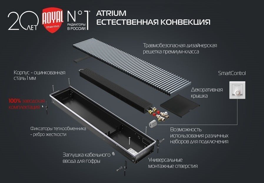 Конвектор внутрипольный ATRIUM – это готовый к монтажу отопительный прибор с медно-алюминиевым теплообменником, работающий по принципу естественной конвекции. Основное назначение конвекторов — это создание тепловой завесы для стеклянных фасадов, панорамных окон жилых, коммерческих и общественных зданий.