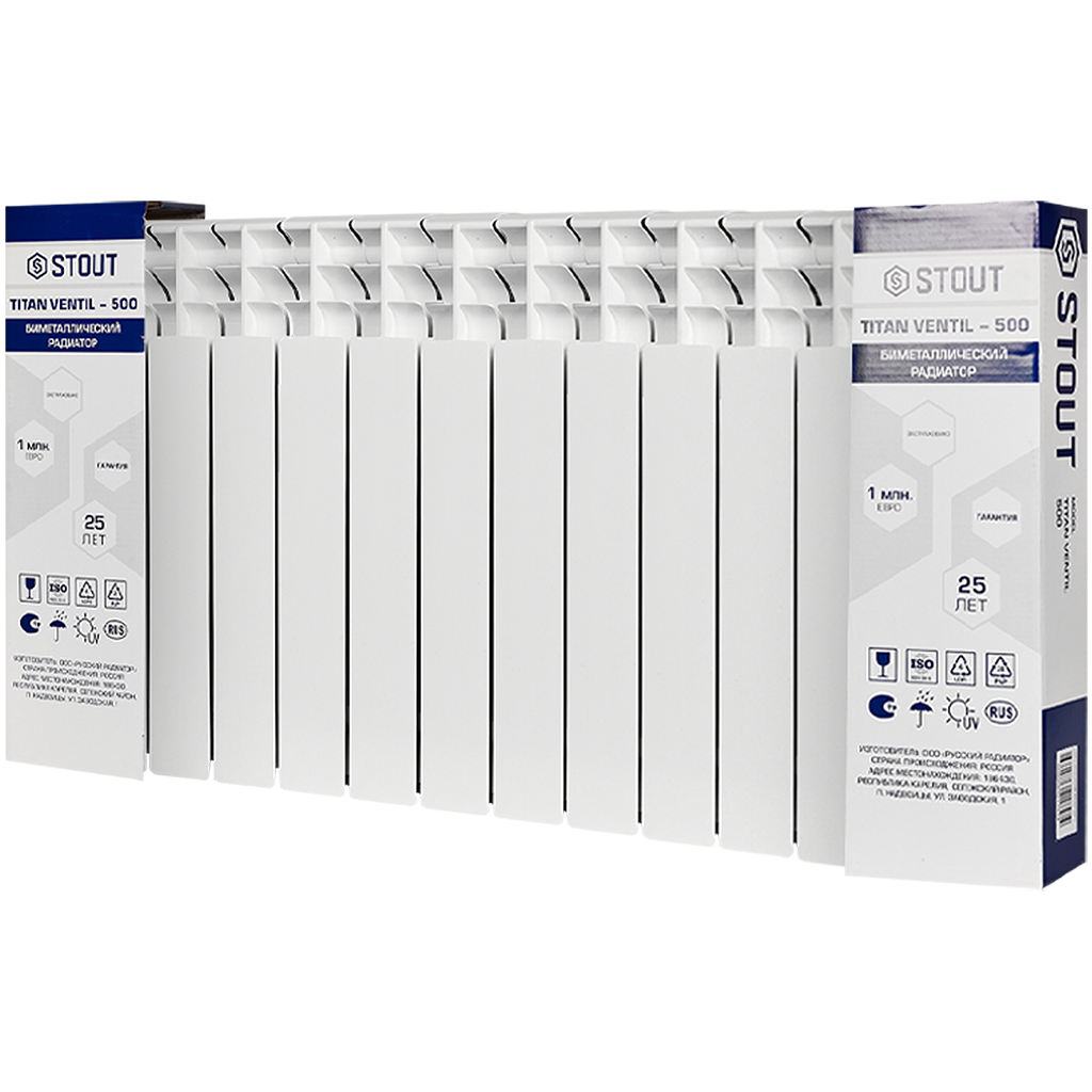 STOUT TITAN VENTIL 500 12 секций радиатор биметаллический нижнее правое подключение (белый RAL 9016) SRB-3320-050012