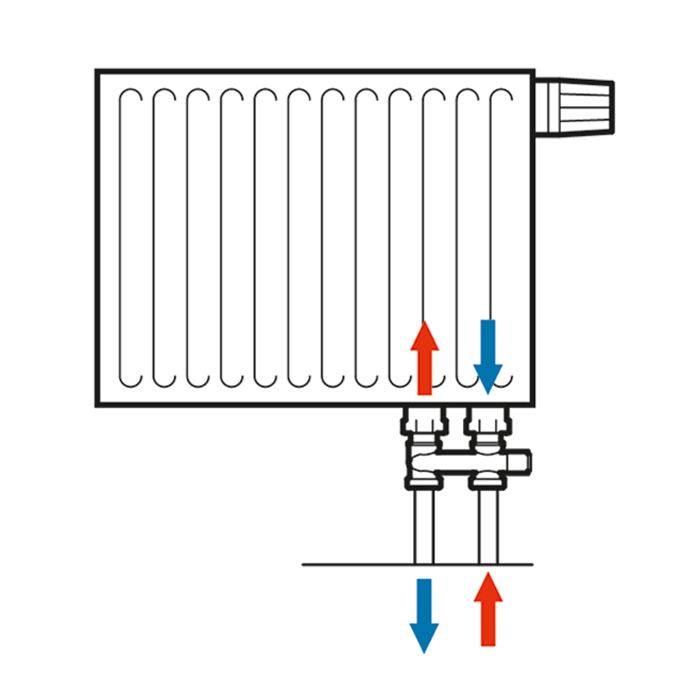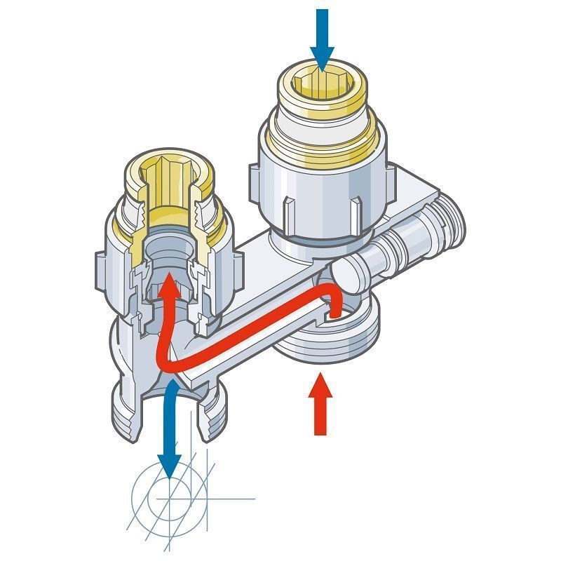 Перекрестный узел – идеальное решение для соединения без пересечений при перестановке подающего и обратного трубопроводов, классический вариант решения проблемы.