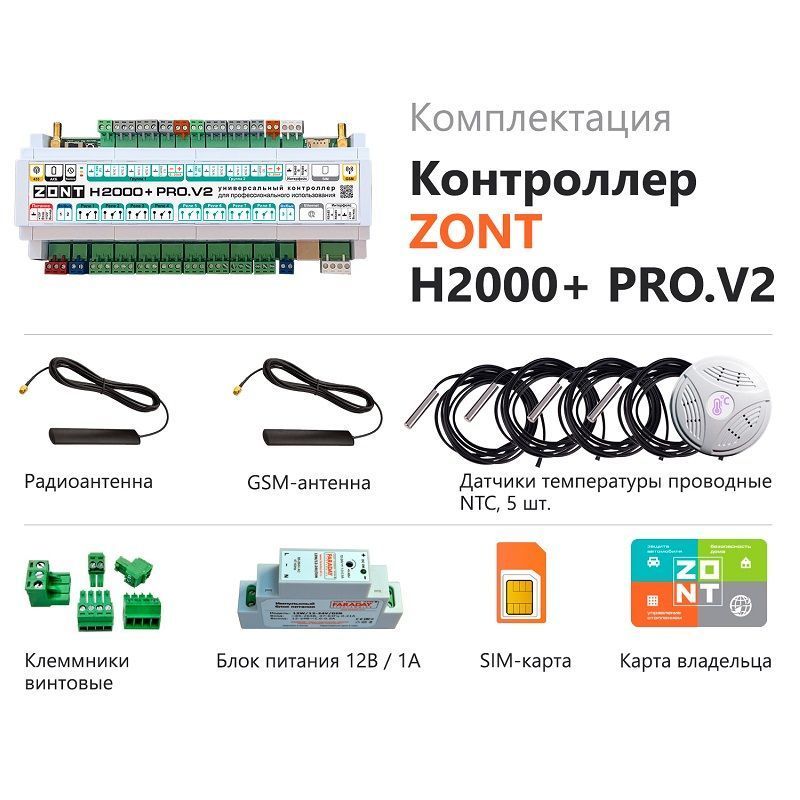 Универсальный контроллер ZONT H2000+ PRO.V2 — обновленная версия контроллера H2000+ PRO. Он обладает возможностями гибкого программирования для решения задач автоматизации и подходит для контроля и управления сложными системами отопления.