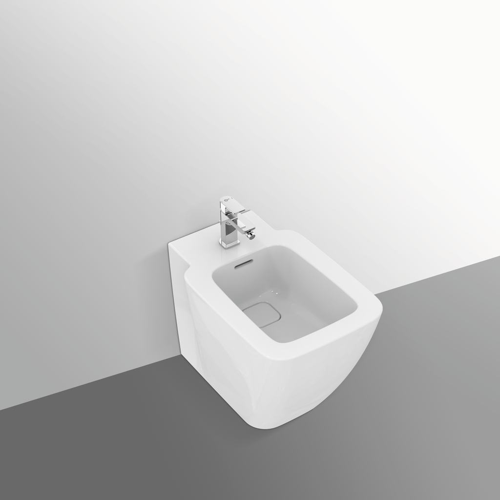 Снято с производства STRADA II Напольное пристенное биде, 1 отверстие под смеситель, с отверстием перелива, с керамической накладкой слива (T854601), с крепежом для полностью скрытого монтажа