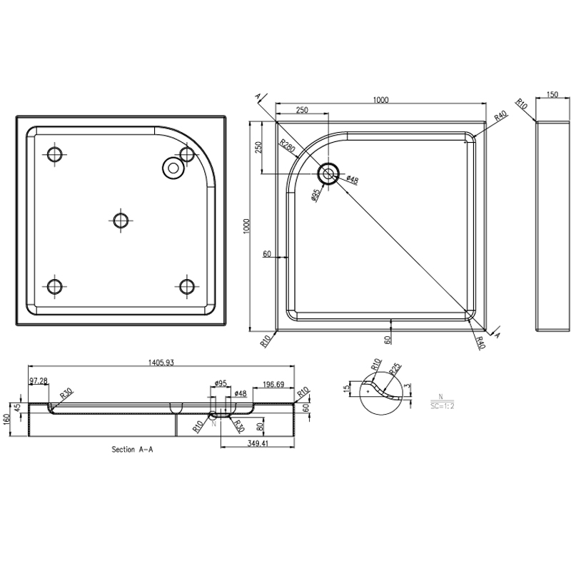 Поддон душевой, квадратный, акриловый (3,5-4 мм толщ.), каркас с ножками, сифон