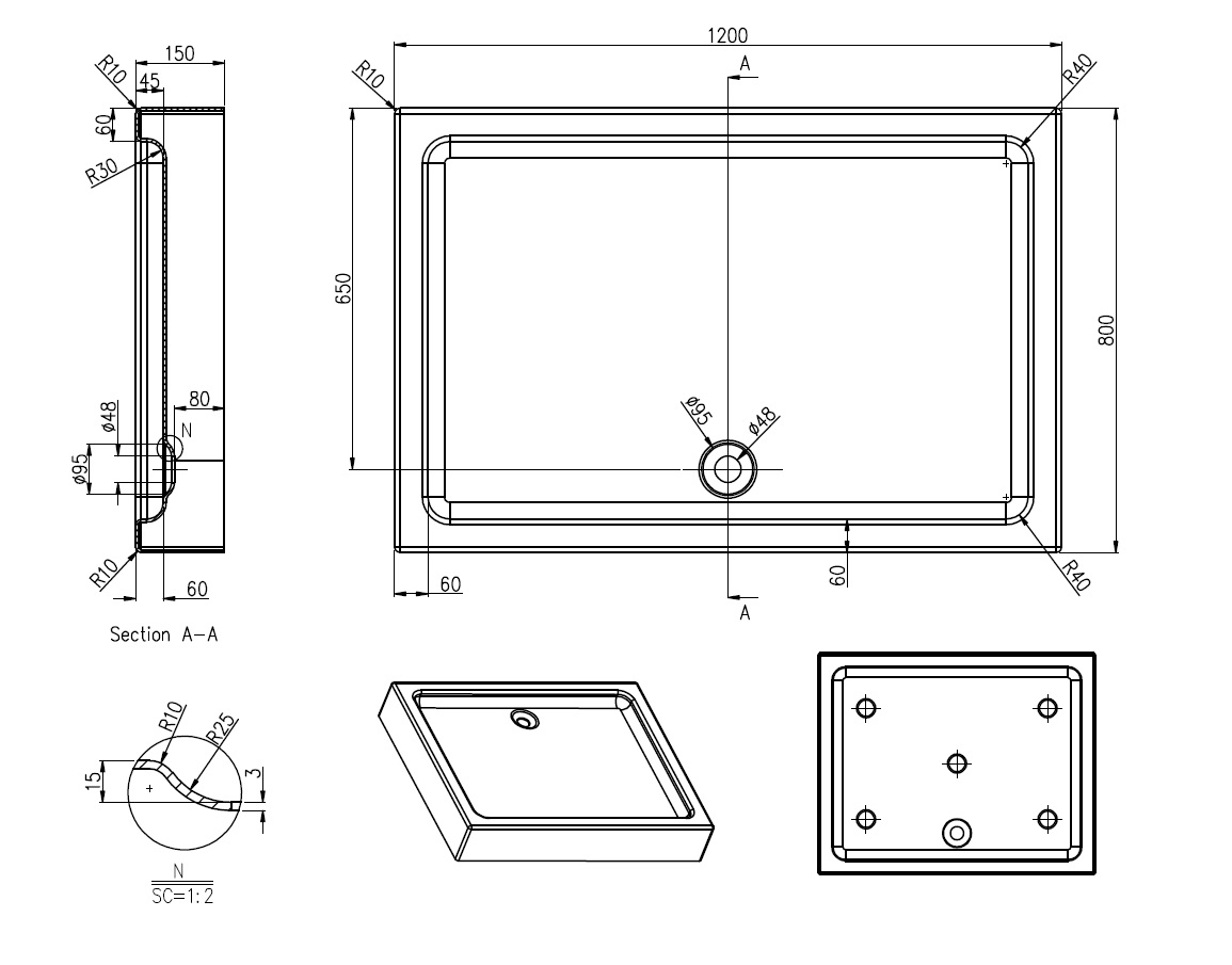 Поддон душевой, прямоугольный, акриловый (3,5-4 мм толщ.), каркас с ножками, сифон