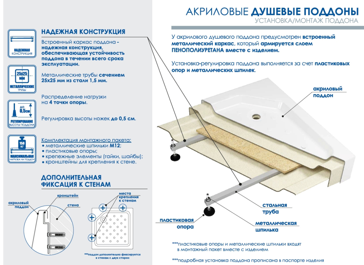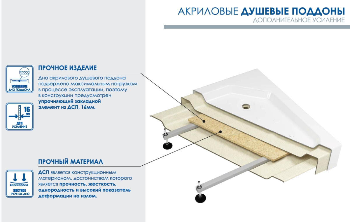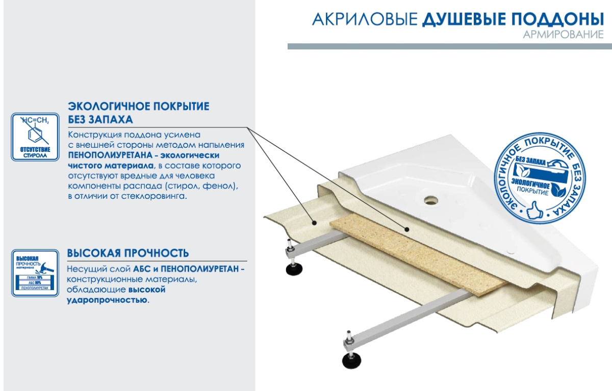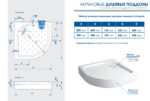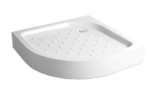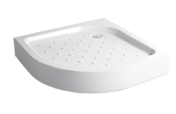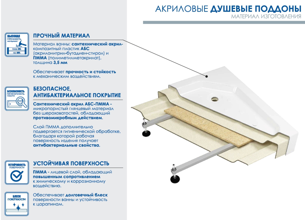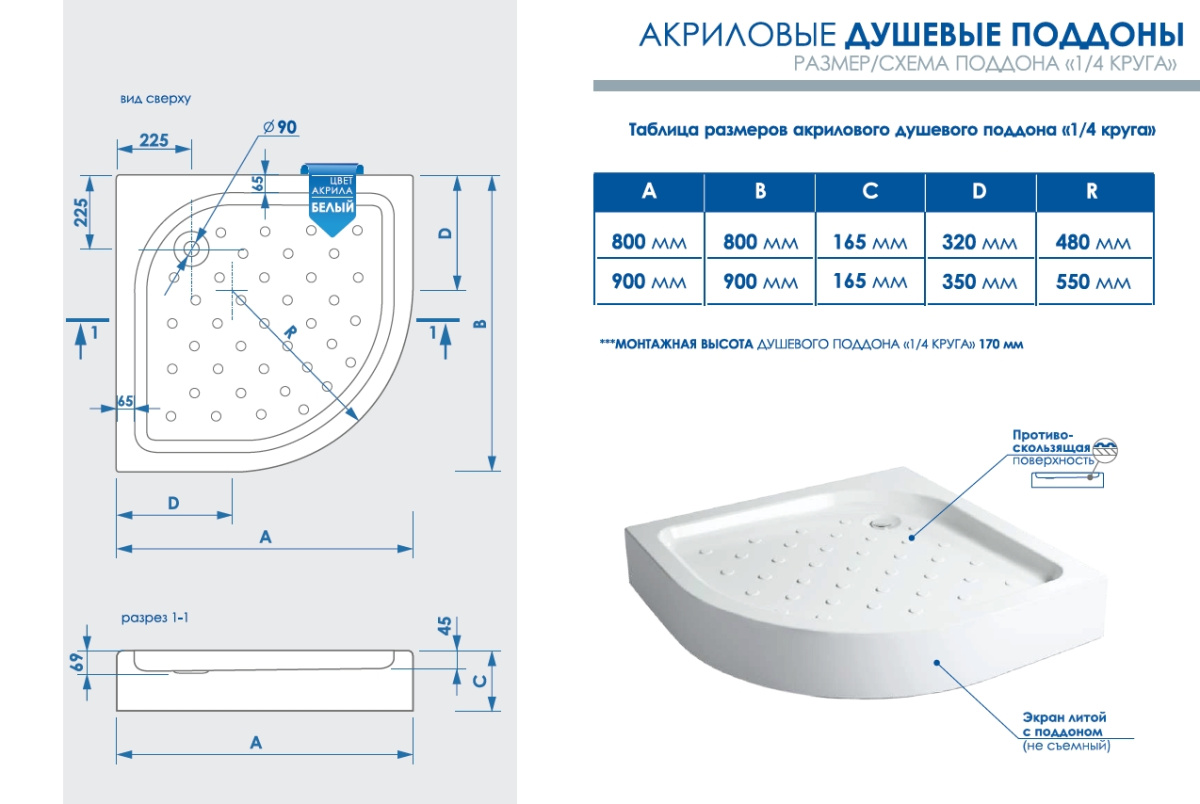 Акриловый душевой поддон “1/4 круга” изготовлен из сантехнического акрила АБС(акрилонитрил-бутадиен-стирол) + ПММА (полиметилметакрилат), толщина 3,5 мм, методом вакуумного формования, противоскользяща поверхность, экран литой с поддоном (не съемный)