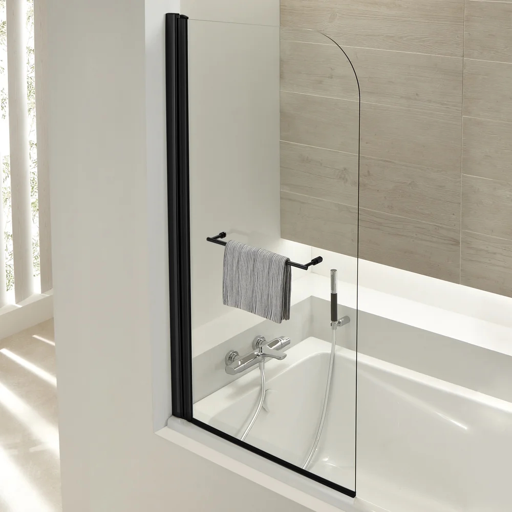 Распашная шторка с лаконичным дизайном защитит пол ванной комнаты от брызг и дополнит интерьер.