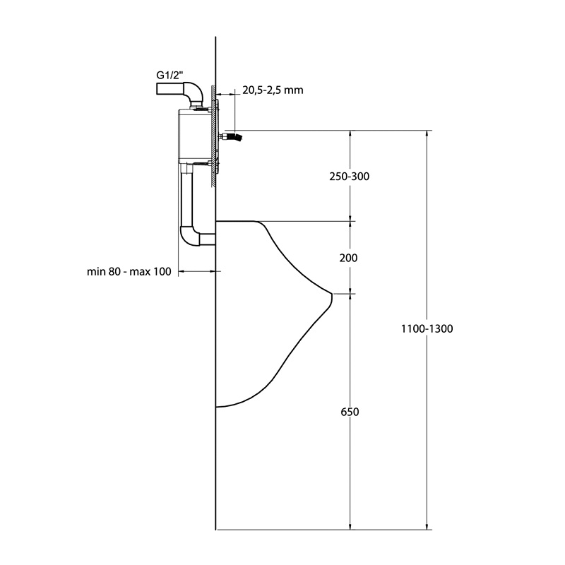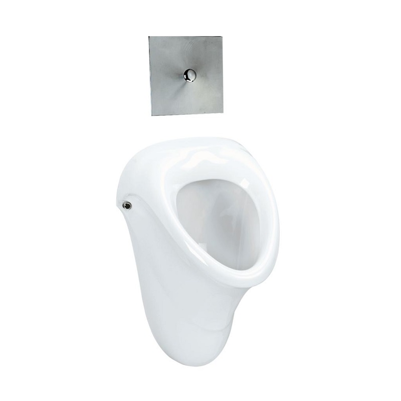 Встраиваемый сливной механизм для писсуара с задней подводкой, с кнопкой (механическое управление), регулировка объема смыва от 2 до 4 л, рабочее давление от 1 до 5 атм, полный комплект, вкл. переходник Г-типа, материал панели – нержавеющая сталь