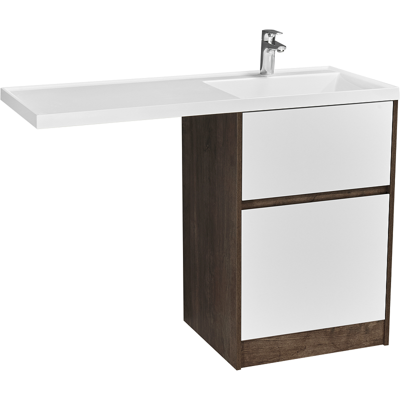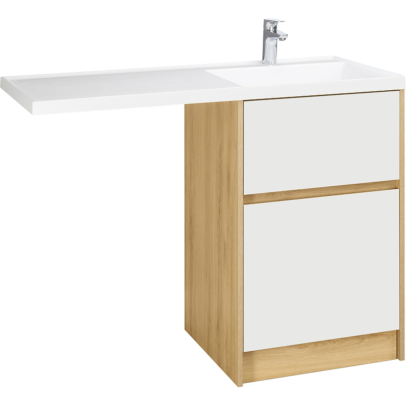 Фасад для тумбы Лондри под стиральную машину выполнен из влагостойкой ламинированной плиты в белом цвете. Корпус тумбы и фасад приобретаются отдельно. Верхний ящик открывается с помощью системы push-to-open, а нижний – за фасад с помощью удобного выпила под углом. Ящики выдерживают нагрузку до 25 кг. Тумба установлена на регулируемые опоры, которые находятся за цоколем. Тумба комплектуется раковиной Лондри 120 из прочного литого мрамора, который устойчив к воздействию химических средств. Широкое крыло раковины обеспечивает ванную комнату дополнительным функциональным пространством. Дополнительно к тумбе можно приобрести шкаф-колонну Лондри и зеркальный шкаф Лондри 120.