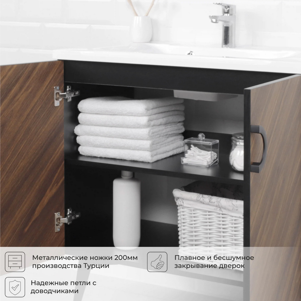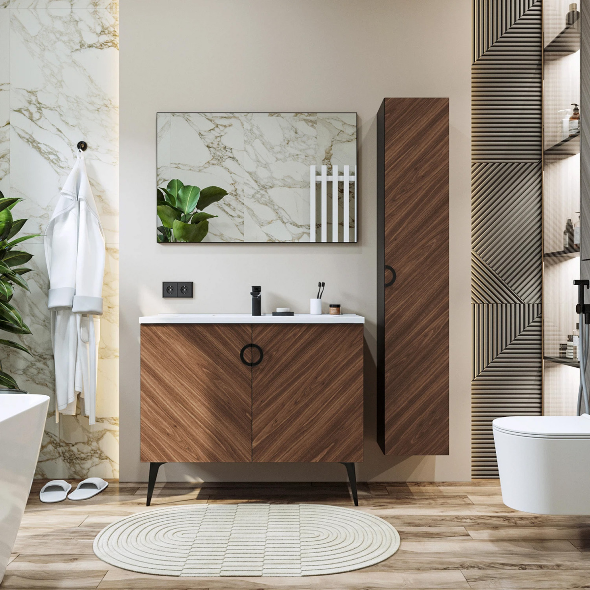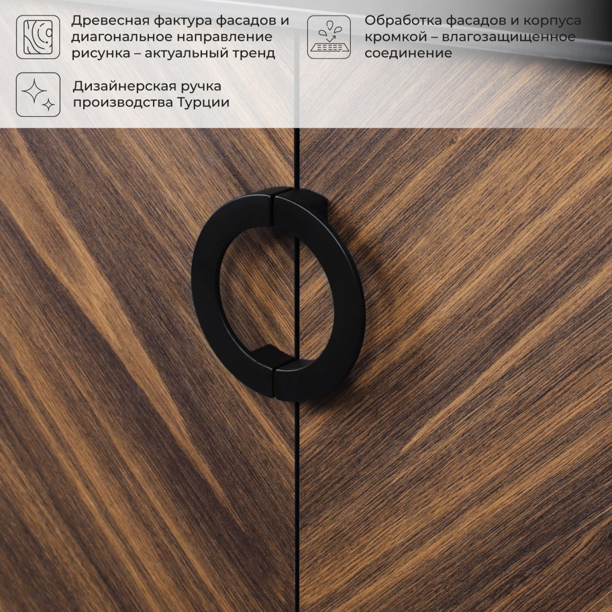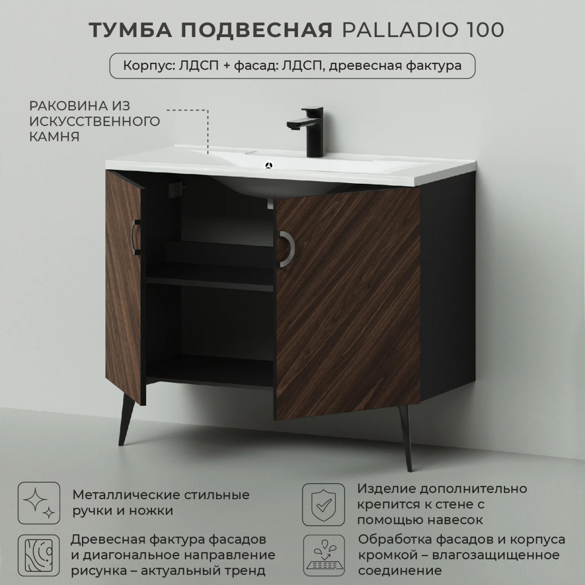 Коллекция Palladio – великолепное звучание современной классики. Изящные пропорции и нестандартный подход к дизайну с сохранением функциональности. Коллекция выполнена из ЛДСП в модных деревянных декорах. Технология производства позволила сделать элементы мебели устойчивыми к влаге. Качественная фурнитура с доводчиками обеспечивает легкое открывание и плавное закрывание дверей. Дизайнерские металлические ручки с покрытием – не только декоративный элемент, но и удобное решение – фасады остаются чистыми при постоянном открывании и закрывании.