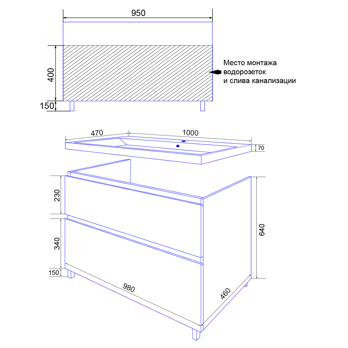 Комплект Тумба Azario Мила 100 Н 1000х470х860 напольная, с раковиной Monte 100, белый CS00089954