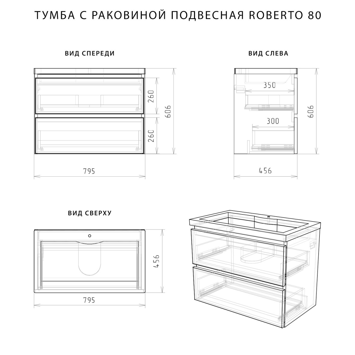 Идеальный белый глянец в сочетании с современным лаконичным дизайном-это коллекция Roberto.Эстетика изящества и минимализма-скругленные фасады,фрезерованные ручки,умывальник из литьевого мрамора,со скругленными углами.Подвесная тумба выполнена из влагозащищенного МДФ,покрытого белоснежной глянцевой эмалью.Качественная фурнитура с доводчиками.Плавное и бесшумное закрывание ящиков.Универсальный пластиковый вырез под сифон.Умывальник из литьевого мрамора полностью закрывает корпус тумбы,что обеспечивает дополнительную защиту от воды.Подвесной способ установки дает возможность не только визуально увеличить пространство, но и обеспечивает быстрый и удобный доступ для уборки.Мебель способна вместить в себя достаточно много вещей.Изысканность,простота и гармоничность-все сошлось в этой прекрасной коллекции!
