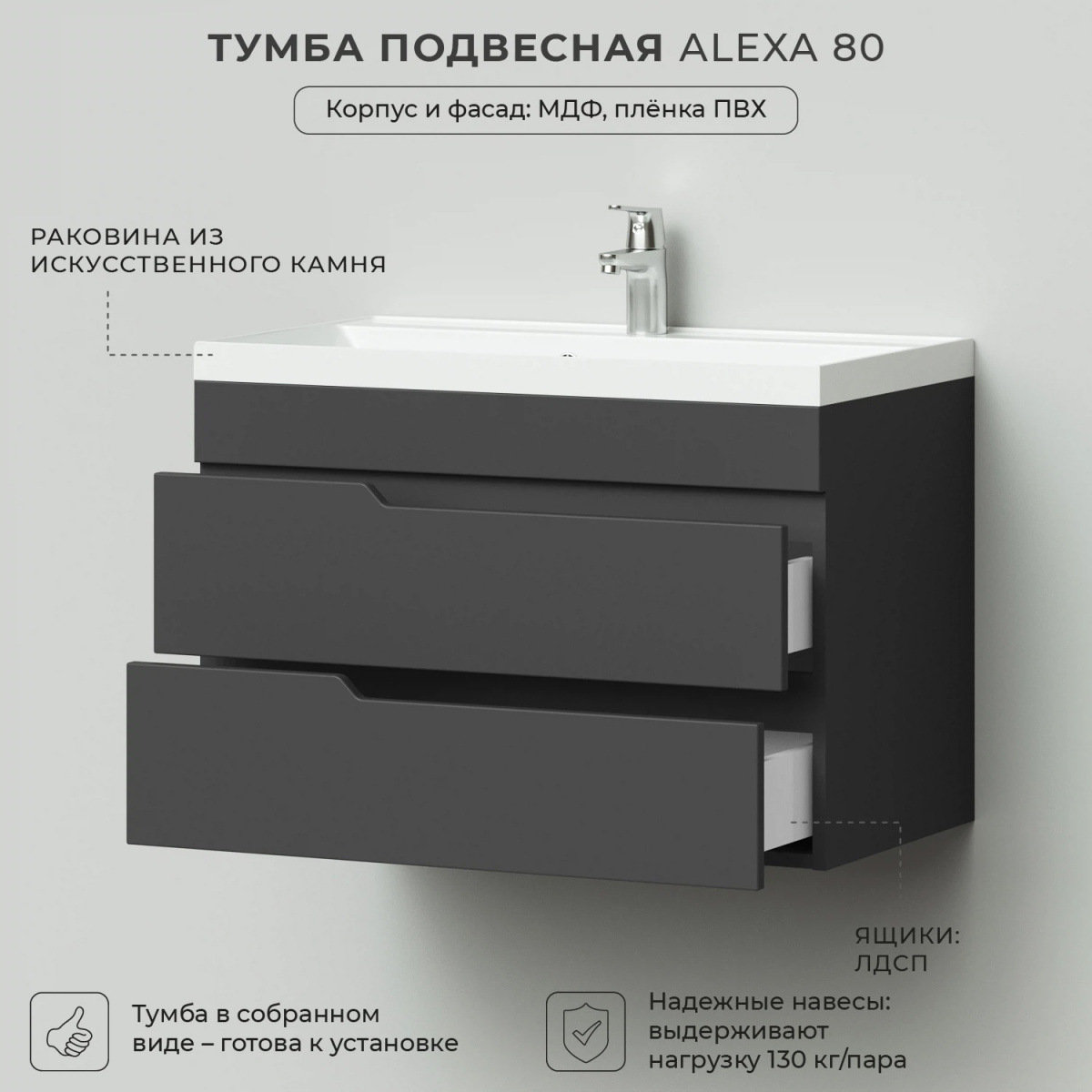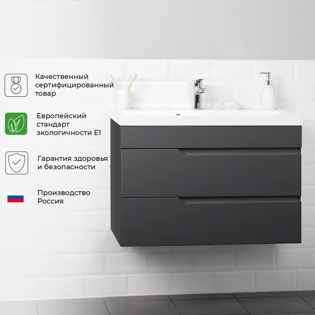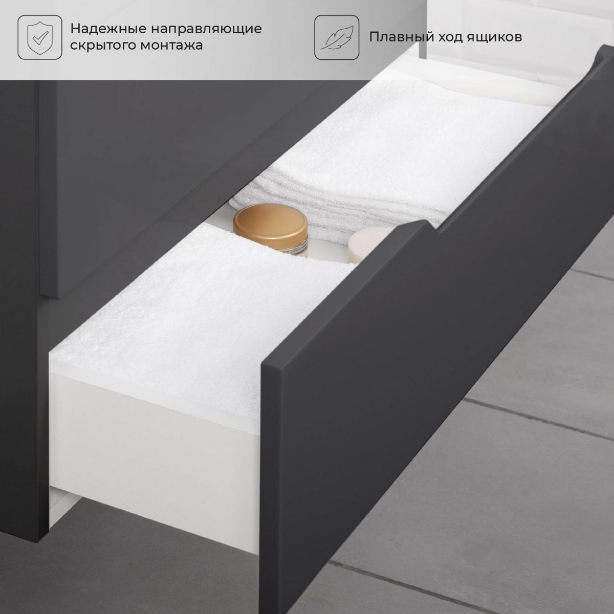 Подвесная тумба с раковиной из коллекции Sky -это сочетание современной стилистики и богатого функционала. Подвесной способ установки дает возможность не только визуально увеличить пространство, но и обеспечивает быстрый и удобный доступ для уборки. Тумба покрыта ПВХ-пленкой с высокой степенью глянца, что обеспечивает изделию привлекательный внешний вид, а также износостойкость и долговечность. Раковина выполнена из искусственного камня. Качественные направляющие скрытого монтажа обеспечивают плавное открывание и закрывание ящичков. Ручки интегрированы в фасад , что исключает возможность случайного удара о фурнитуру.