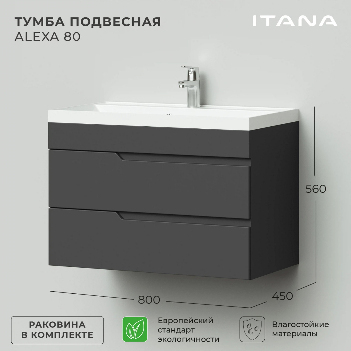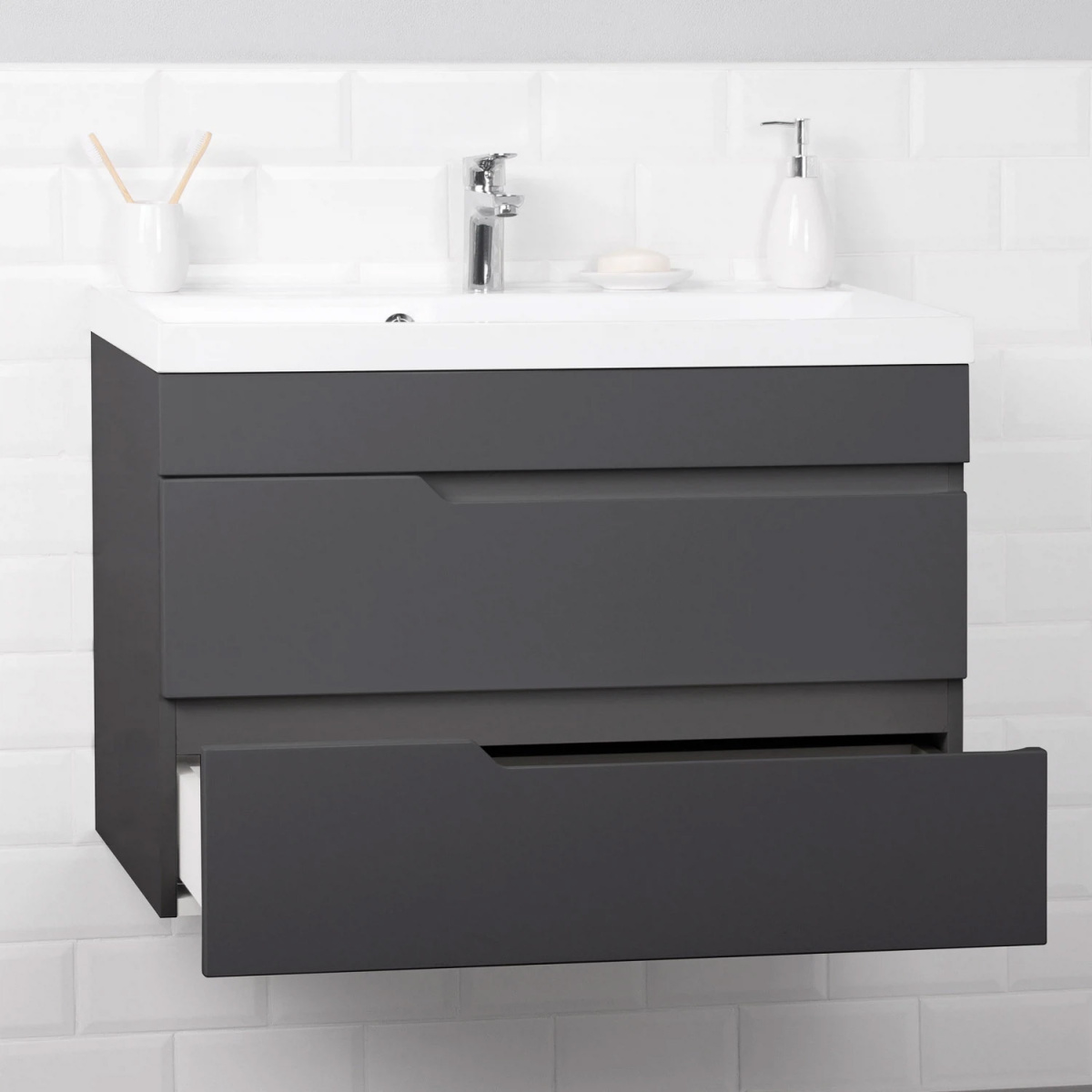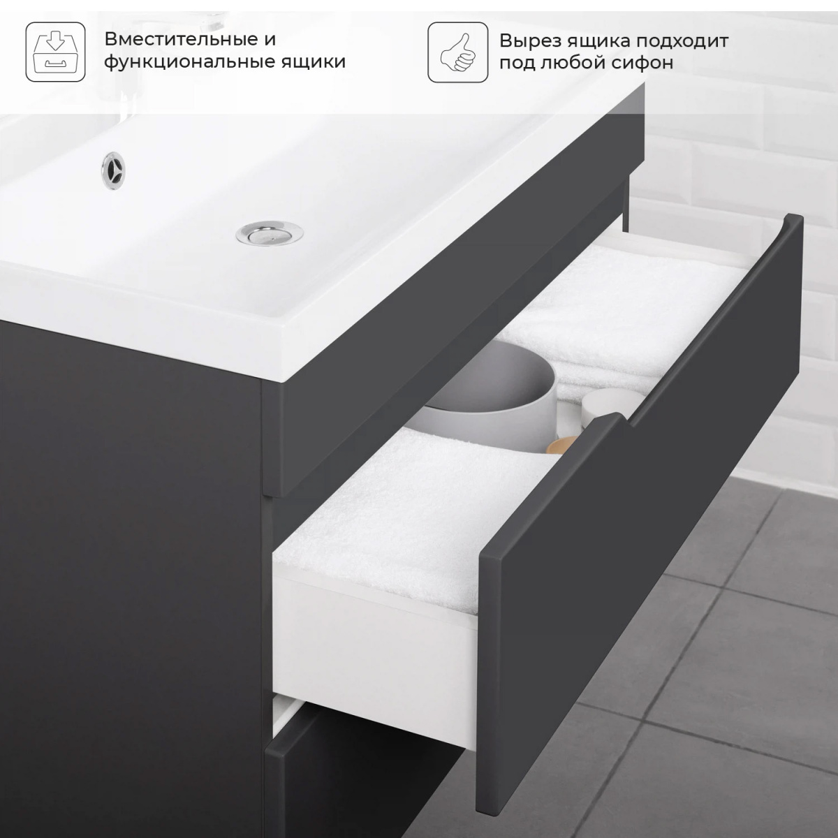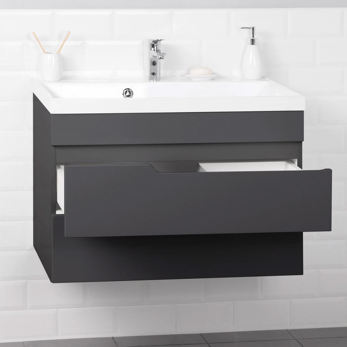 Подвесная тумба с раковиной из коллекции Sky -это сочетание современной стилистики и богатого функционала. Подвесной способ установки дает возможность не только визуально увеличить пространство, но и обеспечивает быстрый и удобный доступ для уборки. Тумба покрыта ПВХ-пленкой с высокой степенью глянца, что обеспечивает изделию привлекательный внешний вид, а также износостойкость и долговечность. Раковина выполнена из искусственного камня. Качественные направляющие скрытого монтажа обеспечивают плавное открывание и закрывание ящичков. Ручки интегрированы в фасад , что исключает возможность случайного удара о фурнитуру.