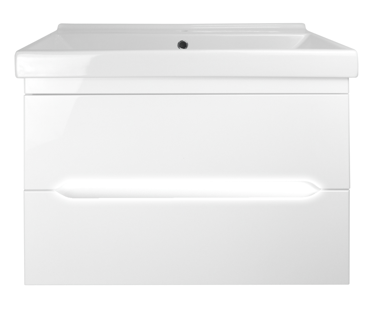 Тумба в собранном виде. Фасад и бока крашеные. Два выдвижных ящика. Между верхним и нижним ящиком встроенная светодиодная подсветка Комплектуется умывальником Fest 80.