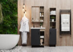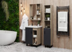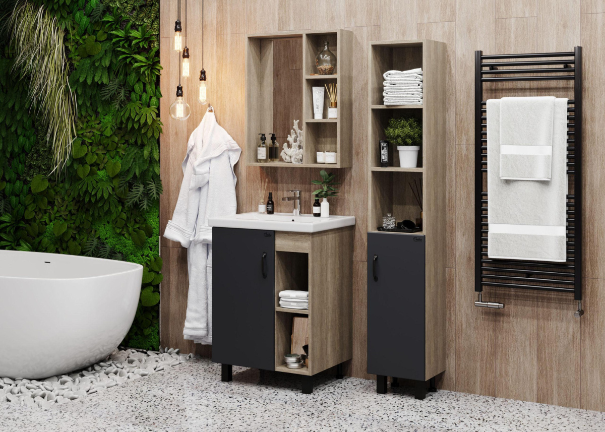 Открытые полки сверху обеспечивают быстрый доступ к часто используемым аксессуарам, а пространство за распашной дверцей снизу, снабженной системой плавного закрывания, станет удобным местом для хранения различных бытовых принадлежностей.