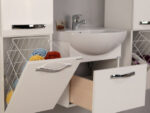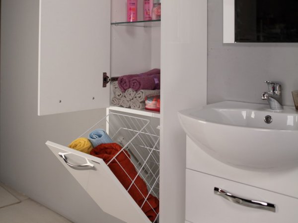 В колонне внизу расположен откидной фасад с бельевой корзиной, а за верхним распашным фасадом расположены регулируемые по высоте полочки.