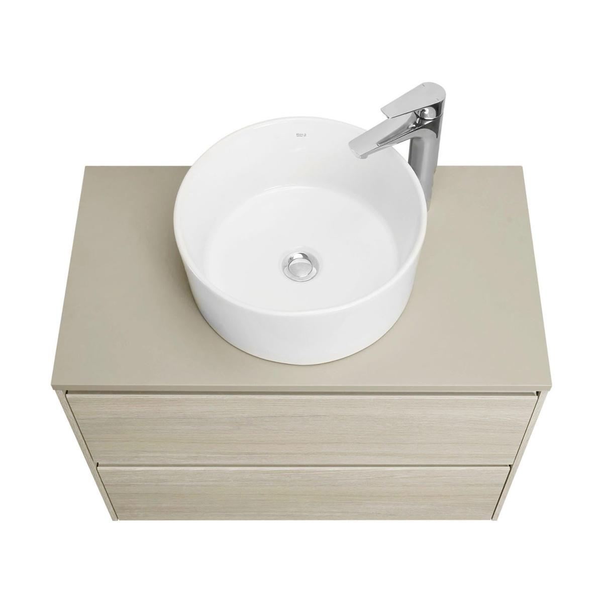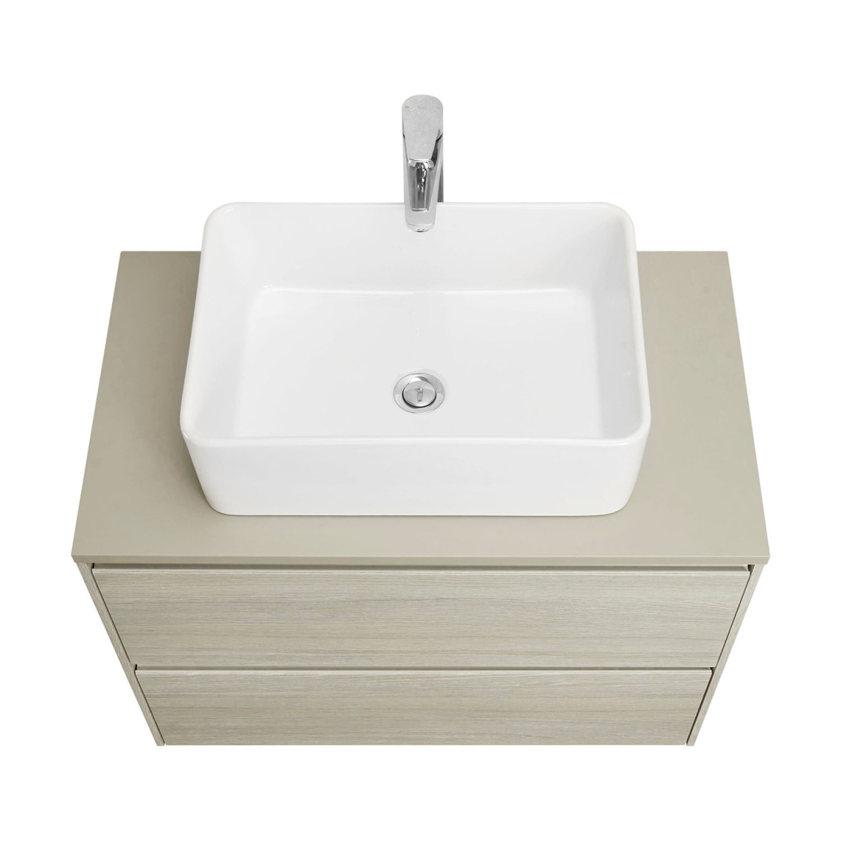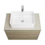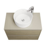 Столешница из МДФ в пленке галечного матового цвета обладает простым, но привлекательным дизайном. Она подойдет для комплектации тумб коллекции Ona накладными раковинами. Отсутствие выреза в столешнице позволяет установить любую накладную раковину.