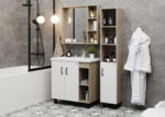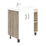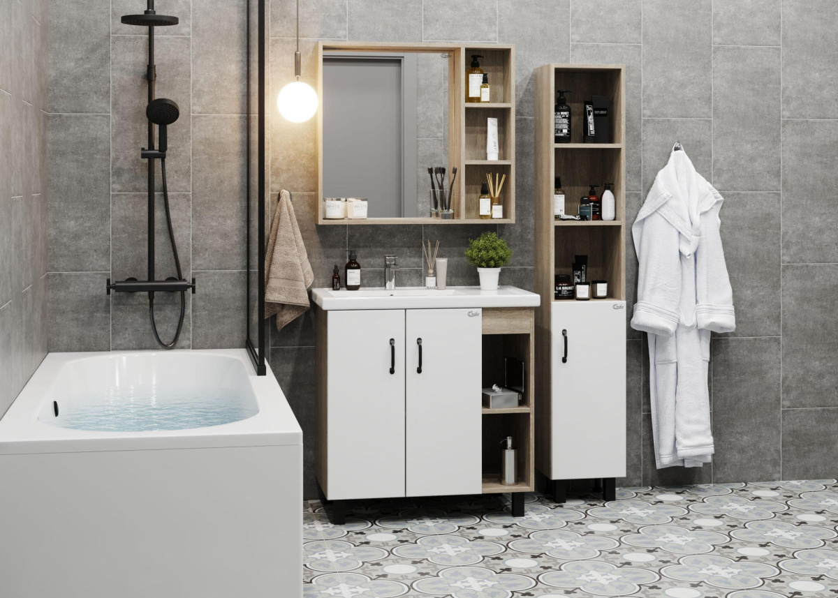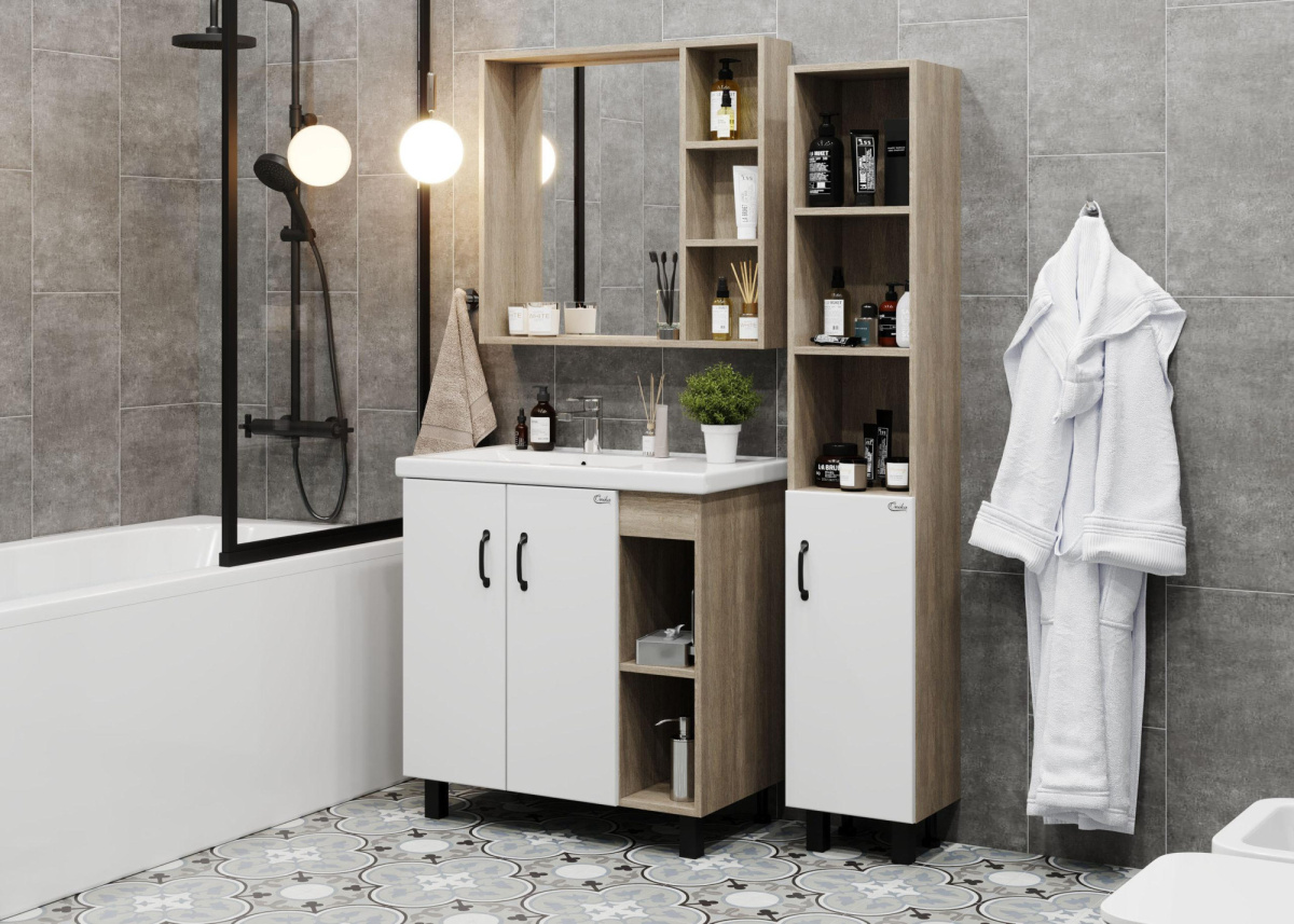 В тумбе Onika ТИМБЕР 80.01 удачно сочетаются контрастные цвета и фактуры: белый матовый фасад с покрытием SoftTouch, корпус цвета дуба с роскошной текстурой, черная матовая металлическая фурнитура.