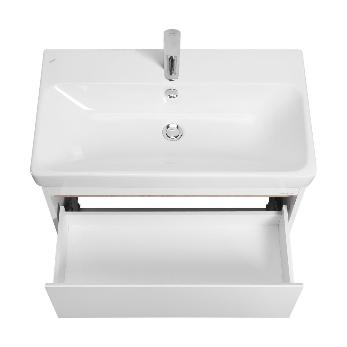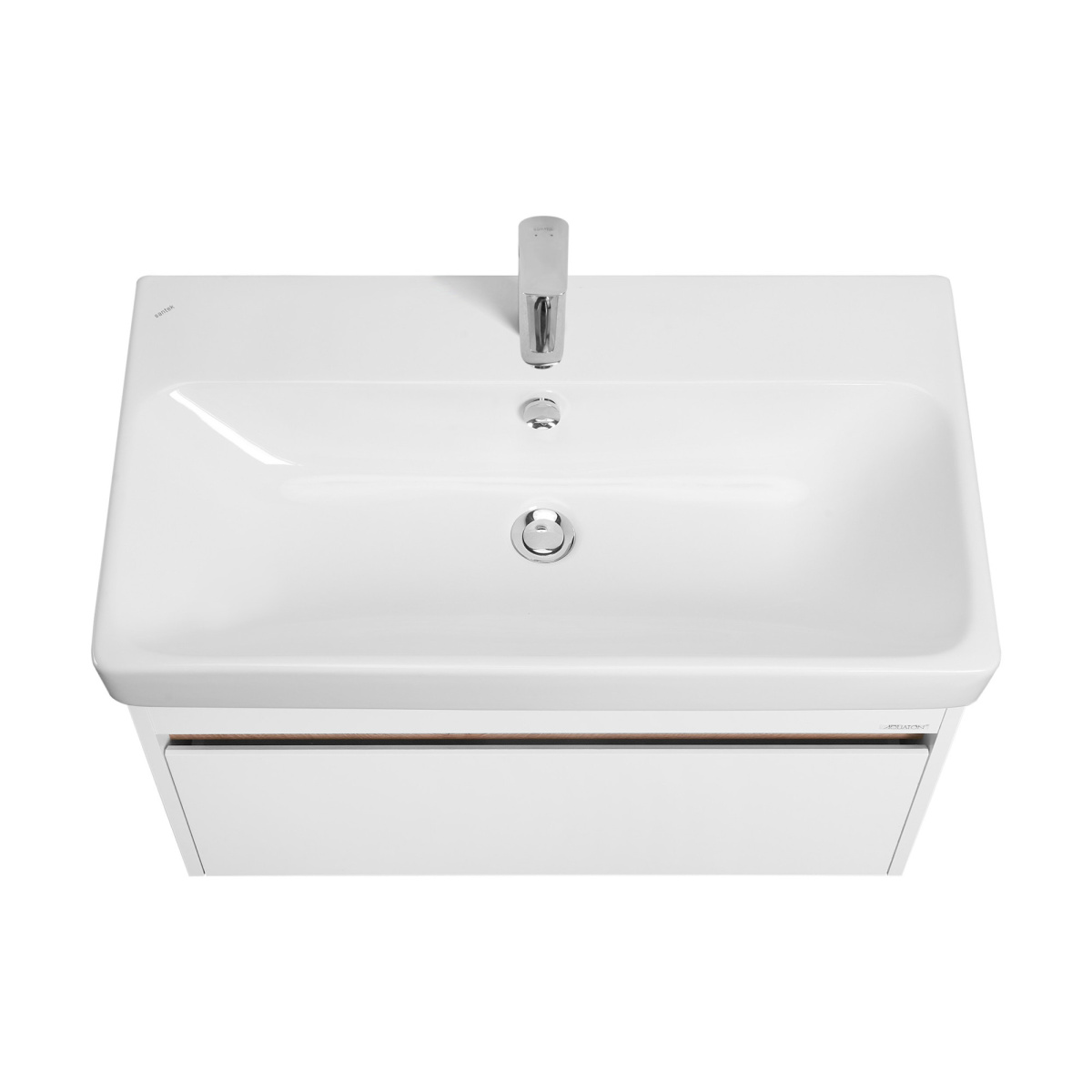 Тумба МАРТИ 80 отличается вместительностью и удобством в использовании: при желании в ящике можно организовать хранение не только шампуней и кремов, но и, например, полотенец. При этом тумба МАРТИ смотрится интересно благодаря выпилу на фасаде, который позволяет открывать тумбу за фасад: в углублении видна контрастная вставка в древесной отделке. Эта акцентная деталь придает модели графичность и позволяет подчеркнуть правильные пропорции тумбы. Корпус и боковые стенки изготовлены из влагостойкой ламинированной ДСП, окрашенной в белый цвет специальной краской ультрафиолетового отверждения для защиты мебели от влаги в условиях ванной комнаты. Декоративная вставка в цвете дуб эндгрейн.