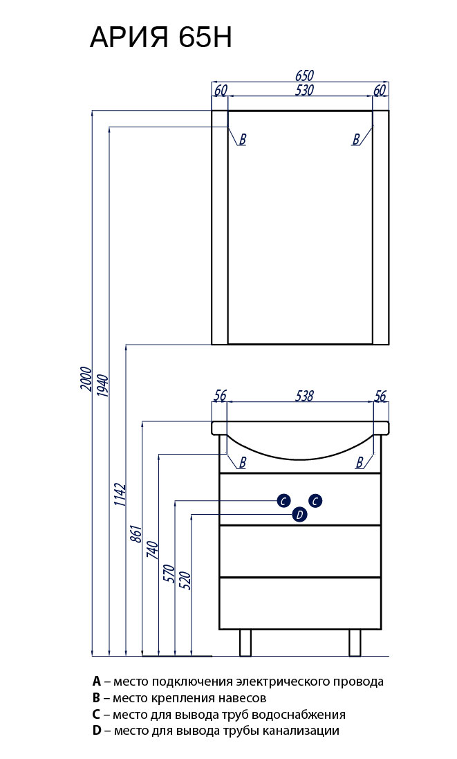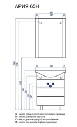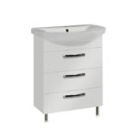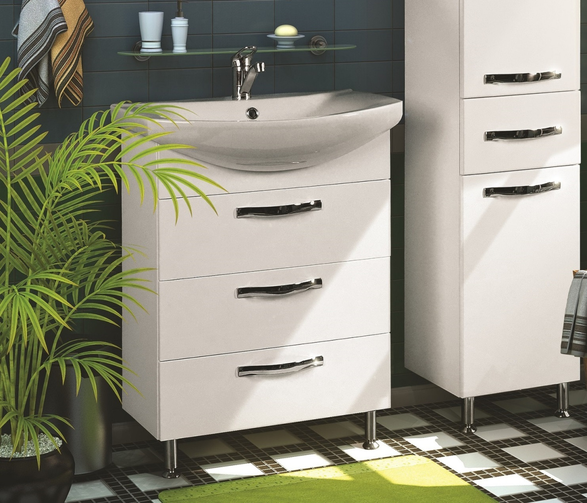 Напольная тумба устанавливается при помощи регулируемых по высоте ножек. В тумбе – три выдвижных ящика из влагостойкой ДСП в отделке «молочный дуб», верхний снабжен системой организации пространства. Ящики установлены на направляющие полного выдвижения немецкого производителя Blum, благодаря чему ими удобно пользоваться даже с керамической раковиной, выступающей вперед.